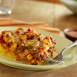 2. Meanwhile, cook beef in medium skillet over medium-high heat 3 to 5 min. or until crumbled and no longer pink, stirring occasionally; drain. Stir in drained tomatoes, tomato sauce, remaining corn and cumin. Pour mixture over top of cornbread batter. Top with cheese.
